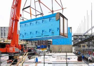 Las posibilidades de prefabricación por módulos en tres dimensiones están totalmente abiertas en cuanto a tipologías edificatorias: desde unidades de vivienda, hasta aulas de colegio, pasando por oficinas. Las unidades 3D llegan totalmente acabadas a obra y solo es necesario conectarlas con el resto. Además, este sistema es tremendamente flexible, dando posibilidad de ampliar el edificio en cualquier momento. Esta sistemática nos recuerda mucho al reciclaje de contenedores de transporte, pero normalmente se fabrican en entramado ligero de madera.