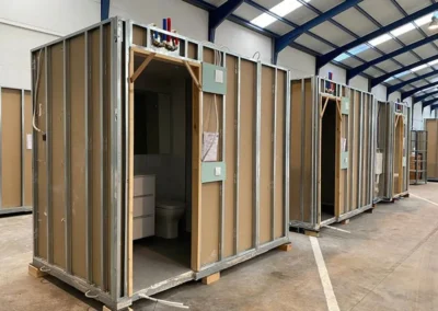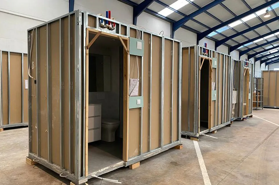 Baños industrializados en planta de fabricación, preparados para instalar en obra. Foto: Lignum Tech.